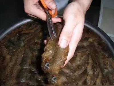 2. 泡发过程:24小时后,海参的体积会明显增大,这时候就可以将海参取出,用剪刀沿着海参的腹部剪开一个小口,取出内脏和沙袋。